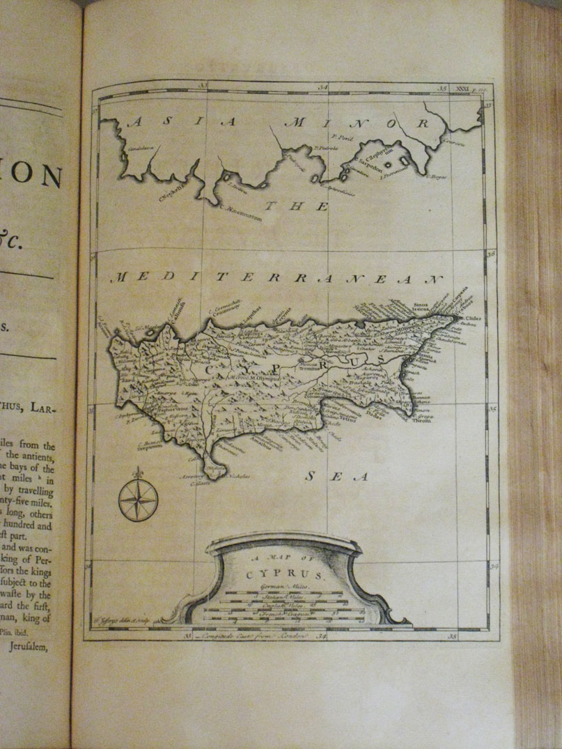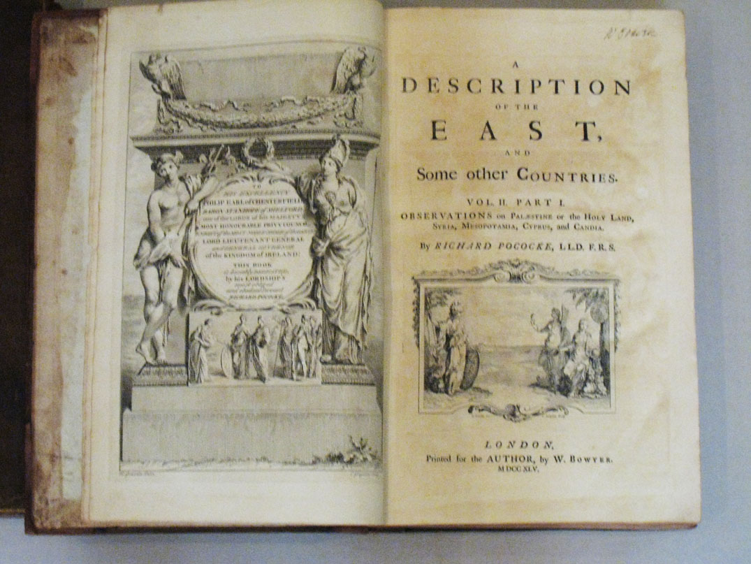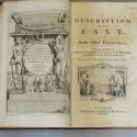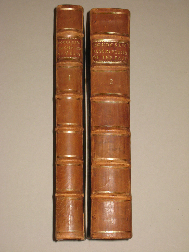 First edition. 2 volumes including 3 parts.folio.Engraved dedication and 178 engraved plates and maps.Original light brown calf with spine gilt. A very fine copy with Ex libris of William Craven dated 1750 and ex libris library of Boies Penrose. Vol I is devoted to Egypt including the first documented printed view of the Valley of the Kings.Vol II dedicated to Palestine, Syria ,Mesopotamia,Cyprus(including a nice printed map) and Crete plus the Greek islands,Asia Minor etc.Pococke travelled from 1737 to 1740 across the East.Described by Gibbon as of "superior learning and dignity". A very good copy with an important provenance.