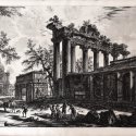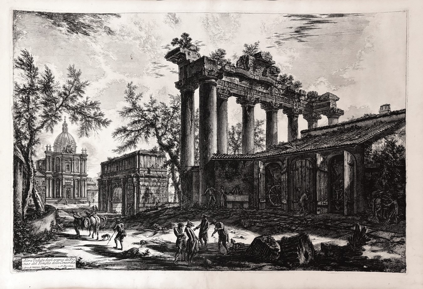 Original etching in its first state ( Hind 110-I) of the . Signed below left , Cavaliere Piranesi.This first state printed in 1774 just four years before the death of Piranesi ( 1720-1778). The etching represents with touches of chiaroscuro and dramatic effects with strong imprint os superb quality. Piranesi is considered the most important engraver at Rome during the XVIII century. Piranesi illustrated antiquities,monuments and archeological remains either in Rome and other parts of Italy. His output of etched plates is about 1000 numbers in all and most of them of larger dimensions. Piranesi provided of antiquities and restored antiques to a distinguihed international clientele visiting Rome eager to buy fragments or complete pieces for decorating theis houses and palaces across Europe. The Grand Tour visitors of Rome found at the Piranesi´s workshop the best place to buy antiquities and also the etchings and different illustrated books published by Piranesi like Veduta di Roma or Antichita de Roma in 4 volumes.The circulation of Piranesis´s works along Europe meant a first hand knowledge of the classical ruins and the development of the neoclassical taste joint with the work of Hamilton and Le Roy that influenced painting, decorative arts,etc.