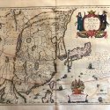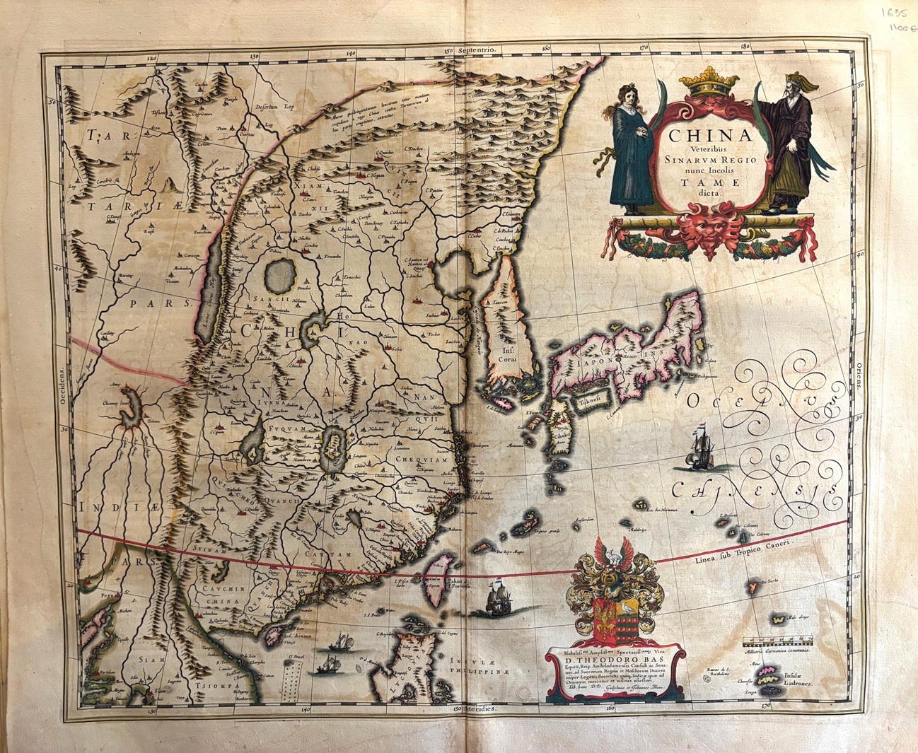 Original map representing China,japan, northern Philippines,Taiwan. large decorative cartouche with figures,ships and coat of arms of Theodoro bas to whom the map is dedicated ( he was the director of the Dutch East India Company).The map represents Korea like an island what became a cartographic misconception represented in all maps during XVI and XVII century until the accurate map by Anville in 1735. This map comes from the first edition of the Theatrum Orbis terrarum sive Atlas Novus. Blaeu ( 1571-1638) was the most important cartographer and editor of atlases in Amsterdam in the first part of XVII century. He studied with Tycho Brahe in 1596 and acquired a wide knowledge in cartography and cosmography. Since 1608 he began the publication of sea routiers and atlases of the european coasts , globes ,instruments and atlases. In 1630 he published his first general atlas: Atlantis Appendix with 60 maps. he was expanding the atlas in the following years and in 1635 he published in two volumes with over 200 maps the Theatrum or Atlas Novus that was enlarged in 3,4,5 and 6 volumes and several languages ( latin, french,dutch and spanish). This core of maps was the base for the publication of the Atlas Mayor by his son Joan Blaeu from 1662 until 1672.