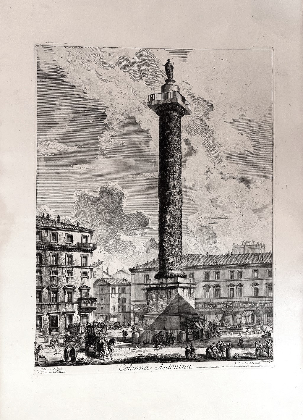 Original etching in its third state ( Hind 52-III) of the Colonna Antonina built by Marcus Aurelius in 180-193 d.c.. Signed below right Piranesi fecit . Piranesi ( 1720-1778). The etching represents with touches of chiaroscuro and dramatic effects with strong imprint os superb quality. Piranesi is considered the most important engraver at Rome during the XVIII century. Piranesi illustrated antiquities,monuments and archeological remains either in Rome and other parts of Italy. His output of etched plates is about 1000 numbers in all and most of them of larger dimensions. Piranesi provided of antiquities and restored antiques to a distinguihed international clientele visiting Rome eager to buy fragments or complete pieces for decorating theis houses and palaces across Europe. The Grand Tour visitors of Rome found at the Piranesi´s workshop the best place to buy antiquities and also the etchings and different illustrated books published by Piranesi like Veduta di Roma or Antichita de Roma in 4 volumes.The circulation of Piranesis´s works along Europe meant a first hand knowledge of the classical ruins and the development of the neoclassical taste joint with the work of Hamilton and Le Roy that influenced painting, decorative arts,etc.