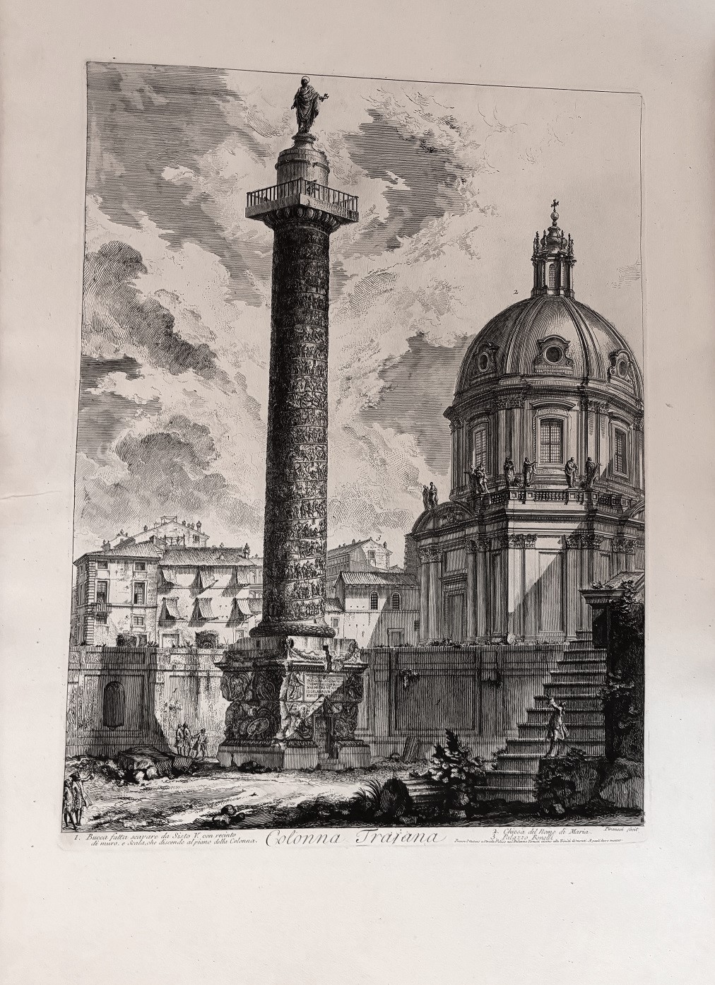 Original etching in its third state ( Hind 51-III) roman imprint of the Trajan Column and Santa Maria church. Signed below right Piranesi fecit. Piranesi ( 1720-1778). The etching represents with touches of chiaroscuro and dramatic effects with strong imprint os superb quality. Piranesi is considered the most important engraver at Rome during the XVIII century. Piranesi illustrated antiquities,monuments and archeological remains either in Rome and other parts of Italy. His output of etched plates is about 1000 numbers in all and most of them of larger dimensions. Piranesi provided of antiquities and restored antiques to a distinguihed international clientele visiting Rome eager to buy fragments or complete pieces for decorating theis houses and palaces across Europe. The Grand Tour visitors of Rome found at the Piranesi´s workshop the best place to buy antiquities and also the etchings and different illustrated books published by Piranesi like Veduta di Roma or Antichita de Roma in 4 volumes.The circulation of Piranesis´s works along Europe meant a first hand knowledge of the classical ruins and the development of the neoclassical taste joint with the work of Hamilton and Le Roy that influenced painting, decorative arts,etc.