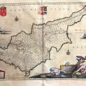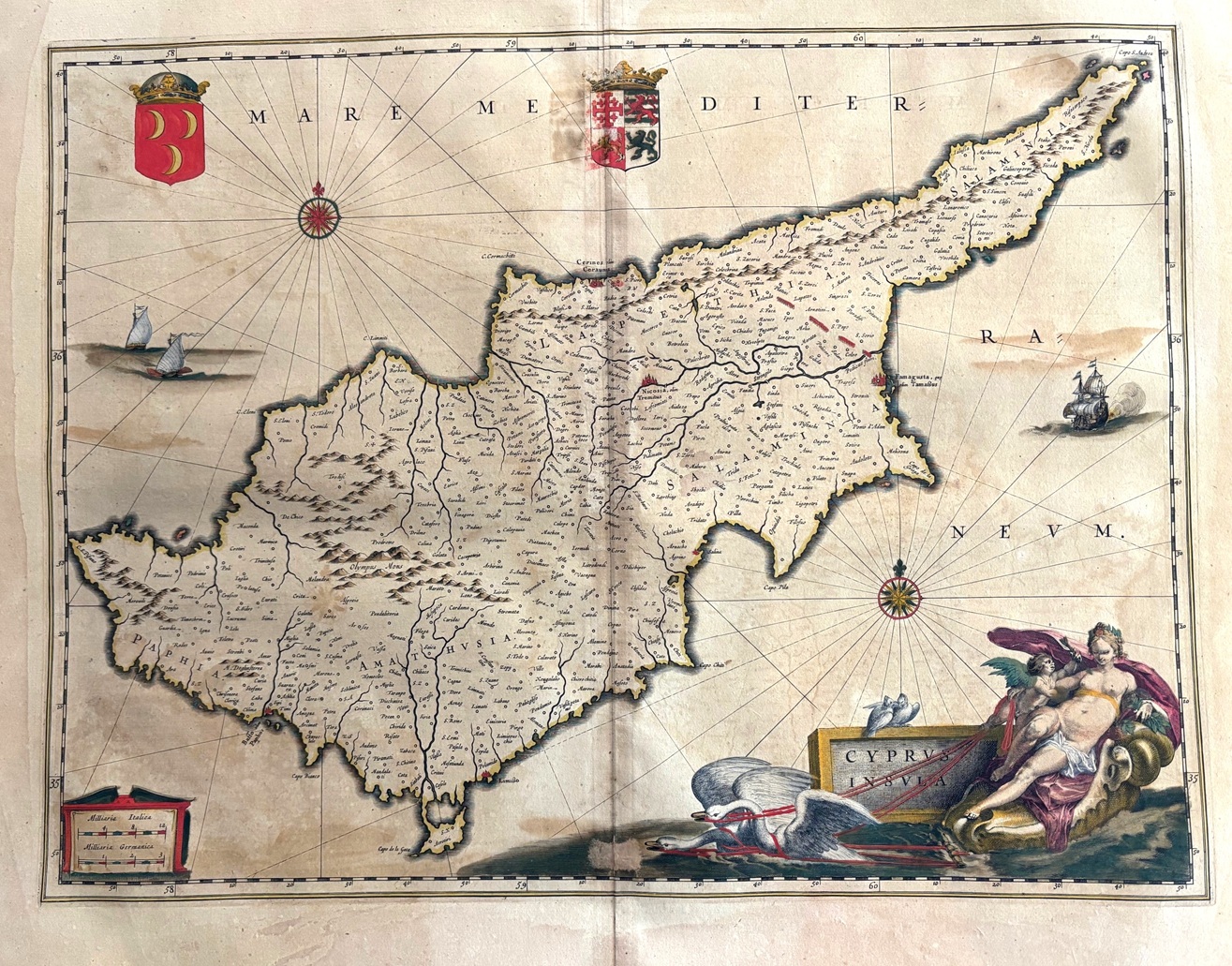Original map representing the island of Cyprus. large cartouche with mithological figures, coat of arms ,scales,wind roses ,ships. This map comes from the first edition of the Theatrum Orbis terrarum sive Atlas Novus. Blaeu ( 1571-1638) was the most important cartographer and editor of atlases in Amsterdam in the first part of XVII century. He studied with Tycho Brahe in 1596 and acquired a wide knowledge in cartography and cosmography. Since 1608 he began the publication of sea routiers and atlases of the european coasts , globes ,instruments and atlases. In 1630 he published his first general atlas: Atlantis Appendix with 60 maps. he was expanding the atlas in the following years and in 1635 he published in two volumes with over 200 maps the Theatrum or Atlas Novus that was enlarged in 3,4,5 and 6 volumes and several languages ( latin, french,dutch and spanish). This core of maps was the base for the publication of the Atlas Mayor by his son Joan Blaeu from 1662 until 1672.
