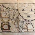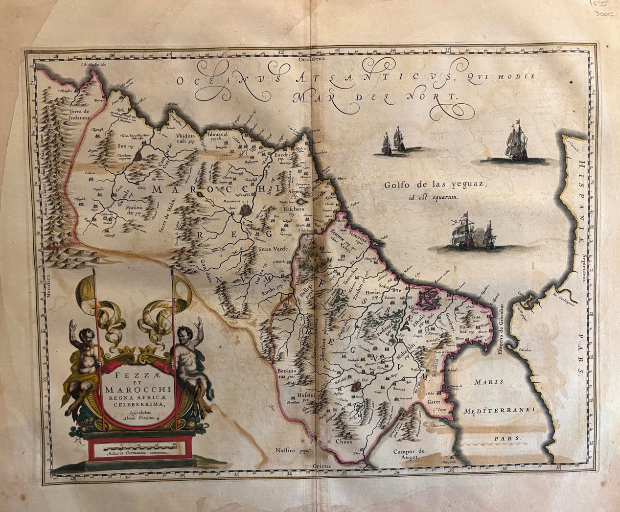 Original map representing the territories of Morocco. large decorative cartouche with allegorical figures ,scales, ships and explanatory text. This map comes from the first edition of the Theatrum Orbis terrarum sive Atlas Novus. Blaeu ( 1571-1638) was the most important cartographer and editor of atlases in Amsterdam in the first part of XVII century. He studied with Tycho Brahe in 1596 and acquired a wide knowledge in cartography and cosmography. Since 1608 he began the publication of sea routiers and atlases of the european coasts , globes ,instruments and atlases. In 1630 he published his first general atlas: Atlantis Appendix with 60 maps. he was expanding the atlas in the following years and in 1635 he published in two volumes with over 200 maps the Theatrum or Atlas Novus that was enlarged in 3,4,5 and 6 volumes and several languages ( latin, french,dutch and spanish). This core of maps was the base for the publication of the Atlas Mayor by his son Joan Blaeu from 1662 until 1672.