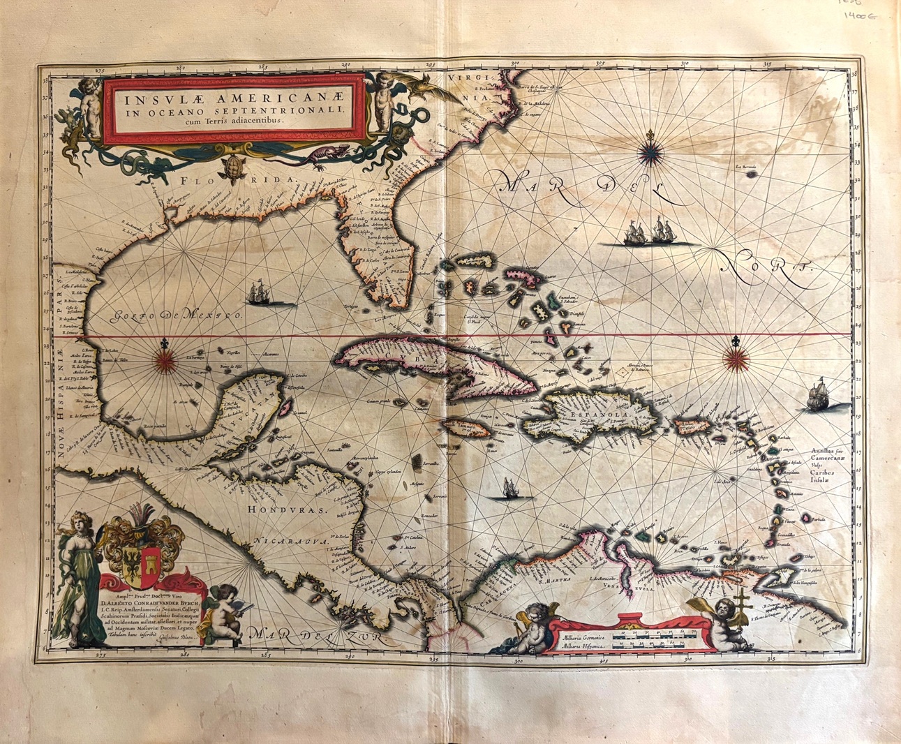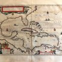 Original map representing the caribbean sea , West Indies, Cuba, Hispaniola, Puerto Rico,Jamaica, Antilles islands . large decorative cartouche with wind rose ,coat of arms, figures,scales, ships and explanatory text. This map comes from the first edition of the Theatrum Orbis terrarum sive Atlas Novus. Blaeu ( 1571-1638) was the most important cartographer and editor of atlases in Amsterdam in the first part of XVII century. He studied with Tycho Brahe in 1596 and acquired a wide knowledge in cartography and cosmography. Since 1608 he began the publication of sea routiers and atlases of the european coasts , globes ,instruments and atlases. In 1630 he published his first general atlas: Atlantis Appendix with 60 maps. he was expanding the atlas in the following years and in 1635 he published in two volumes with over 200 maps the Theatrum or Atlas Novus that was enlarged in 3,4,5 and 6 volumes and several languages ( latin, french,dutch and spanish). This core of maps was the base for the publication of the Atlas Mayor by his son Joan Blaeu from 1662 until 1672.