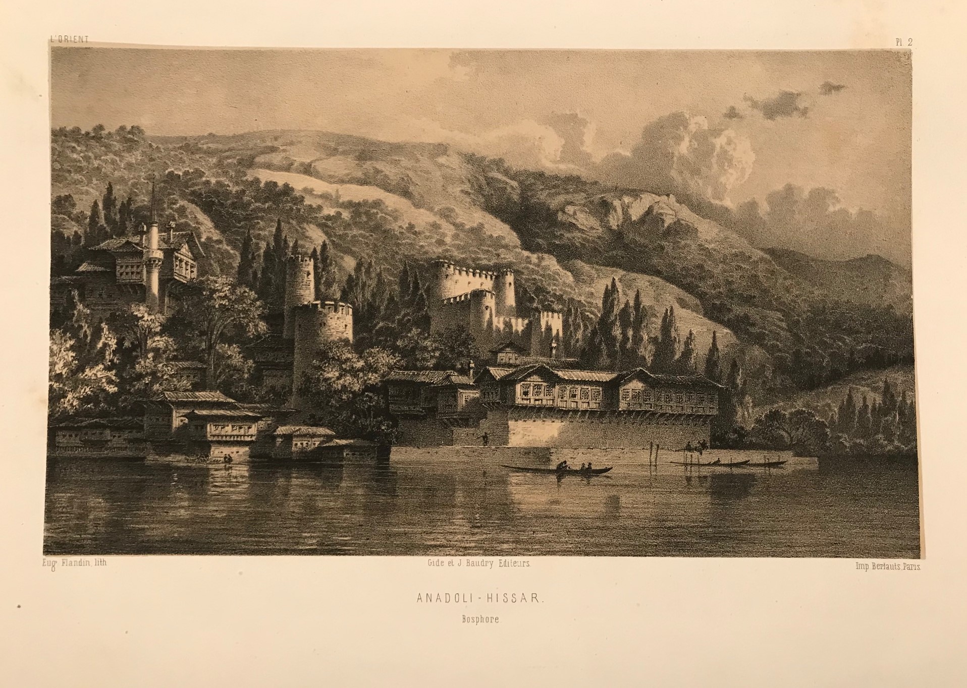 Original lithography,54x 35 cms including wide margins.The lithography represents a view of the Anadoluhisari fortress built by the turks at the end of XIV century. Eugene Napoleón Flandin was an accomplished artist and antiquary accompanied the french ambassador to Persia, De Cercey from 1839-41. In 1843 he assisted Botta in his excavations at Niniveh and Khorsabad and took part in the publication of the "Voyage a Ninive". The lithography comes from the work "L´Orient" being volume I devoted to Constantinople with a selection of fine views. The book was published in installments and is considered one of the best books dedicated to Turkey in the XIX century. Flandin was pupil of Horace Vernet.