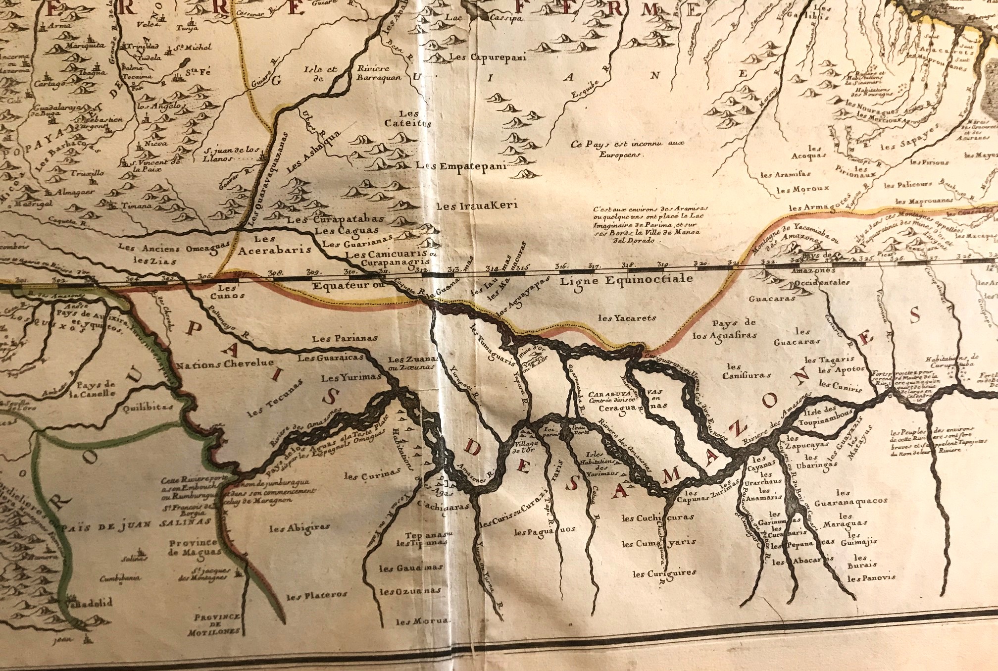 Fine map of the north part of South American continent representing what is nowadays Colombia, Venezuela, Panama, Brasil, Amazonas river,etc . The information is provided by Jesuit missionaries sources. De Fer was royal cartographer of Kings Louis XIV and XV .