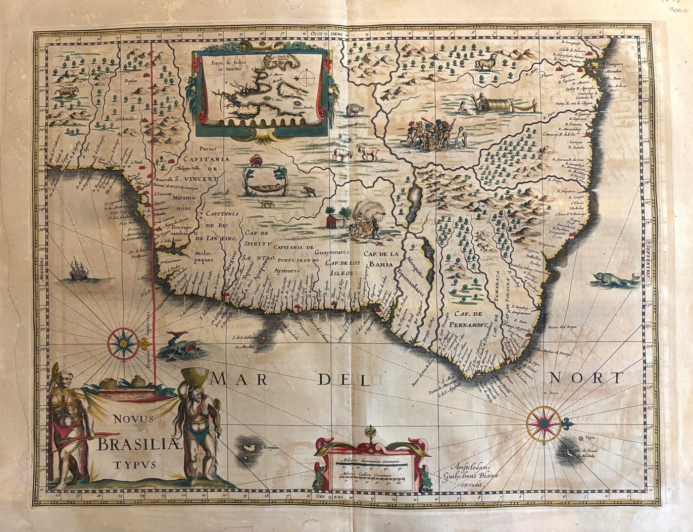 Original map representing the territories of Brasil . large decorative cartouche with indian figures,wind rose ,scales, ships and explanatory text. This map comes from the first edition of the Theatrum Orbis terrarum sive Atlas Novus. Blaeu ( 1571-1638) was the most important cartographer and editor of atlases in Amsterdam in the first part of XVII century. He studied with Tycho Brahe in 1596 and acquired a wide knowledge in cartography and cosmography. Since 1608 he began the publication of sea routiers and atlases of the european coasts , globes ,instruments and atlases. In 1630 he published his first general atlas: Atlantis Appendix with 60 maps. he was expanding the atlas in the following years and in 1635 he published in two volumes with over 200 maps the Theatrum or Atlas Novus that was enlarged in 3,4,5 and 6 volumes and several languages ( latin, french,dutch and spanish). This core of maps was the base for the publication of the Atlas Mayor by his son Joan Blaeu from 1662 until 1672.