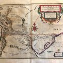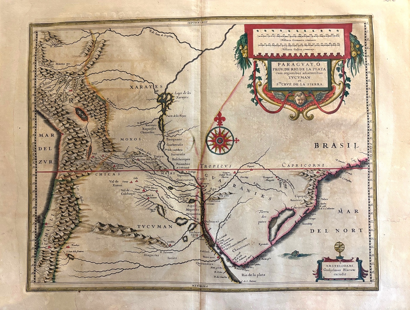 Original map representing the territories of Paraguay. large decorative cartouche with wind rose ,scales and explanatory text. This map comes from the first edition of the Theatrum Orbis terrarum sive Atlas Novus. Blaeu ( 1571-1638) was the most important cartographer and editor of atlases in Amsterdam in the first part of XVII century. He studied with Tycho Brahe in 1596 and acquired a wide knowledge in cartography and cosmography. Since 1608 he began the publication of sea routiers and atlases of the european coasts , globes ,instruments and atlases. In 1630 he published his first general atlas: Atlantis Appendix with 60 maps. he was expanding the atlas in the following years and in 1635 he published in two volumes with over 200 maps the Theatrum or Atlas Novus that was enlarged in 3,4,5 and 6 volumes and several languages ( latin, french,dutch and spanish). This core of maps was the base for the publication of the Atlas Mayor by his son Joan Blaeu from 1662 until 1672.
