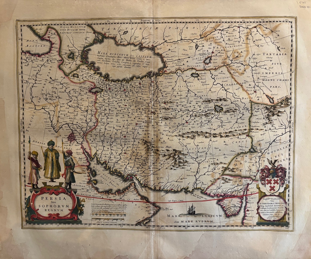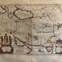 Original map representing the Persia ,caspian sea ,Ormuz strait and eastern Arabia peninsula. This map comes from the first edition of the Theatrum Orbis terrarum sive Atlas Novus. Blaeu ( 1571-1638) was the most important cartographer and editor of atlases in Amsterdam in the first part of XVII century. He studied with Tycho Brahe in 1596 and acquired a wide knowledge in cartography and cosmography. Since 1608 he began the publication of sea routiers and atlases of the european coasts , globes ,instruments and atlases. In 1630 he published his first general atlas: Atlantis Appendix with 60 maps. he was expanding the atlas in the following years and in 1635 he published in two volumes with over 200 maps the Theatrum or Atlas Novus that was enlarged in 3,4,5 and 6 volumes and several languages ( latin, french,dutch and spanish). This core of maps was the base for the publication of the Atlas Mayor by his son Joan Blaeu from 1662 until 1672.