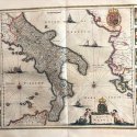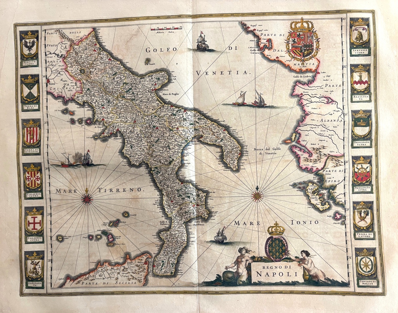 Original map representing the kingdom of Naples. Large cartouche with figures, coat of arms at borders,wind rose and large spanish coat of arm on upper right side . This map comes from the first edition of the Theatrum Orbis terrarum sive Atlas Novus. Blaeu ( 1571-1638) was the most important cartographer and editor of atlases in Amsterdam in the first part of XVII century. He studied with Tycho Brahe in 1596 and acquired a wide knowledge in cartography and cosmography. Since 1608 he began the publication of sea routiers and atlases of the european coasts , globes ,instruments and atlases. In 1630 he published his first general atlas: Atlantis Appendix with 60 maps. he was expanding the atlas in the following years and in 1635 he published in two volumes with over 200 maps the Theatrum or Atlas Novus that was enlarged in 3,4,5 and 6 volumes and several languages ( latin, french,dutch and spanish). This core of maps was the base for the publication of the Atlas Mayor by his son Joan Blaeu from 1662 until 1672.