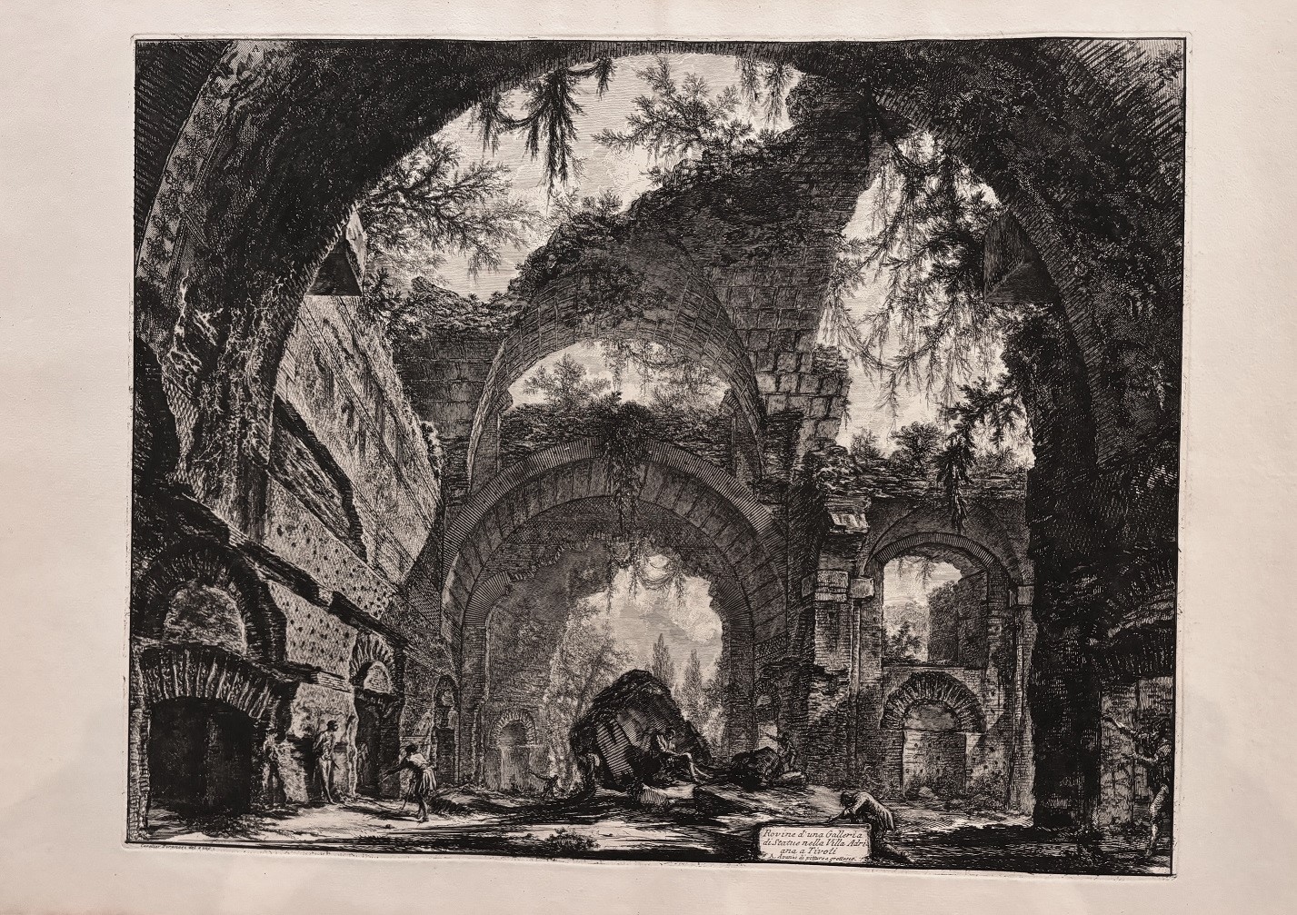Original etching in its first state ( Hind 93-I) of the vaulted galleries at Villa Adriana. The etching represents a breathtaking view with touches of chiaroscuro and dramatic effects with strong imprint of superb quality. Piranesi is considered the most important engraver at Rome during the XVIII century. Piranesi illustrated antiquities,monuments and archeological remains either in Rome and other parts of Italy. His output of etched plates is about 1000 numbers in all and most of them of larger dimensions. Piranesi provided of antiquities and restored antiques to a distinguihed international clientele visiting Rome eager to buy fragments or complete pieces for decorating their houses and palaces across Europe. The Grand Tour visitors of Rome found at the Piranesi´s workshop the best place to buy antiquities and also the etchings and different illustrated books published by Piranesi like Veduta di Roma or Antichita di Roma in 4 volumes.The circulation of Piranesis´s works along Europe meant a first hand knowledge of the classical ruins and the development of the neoclassical taste joint with the work of other authors like Hamilton,Robert Adam and Le Roy that influenced painting, decorative arts, architecture, etc.