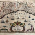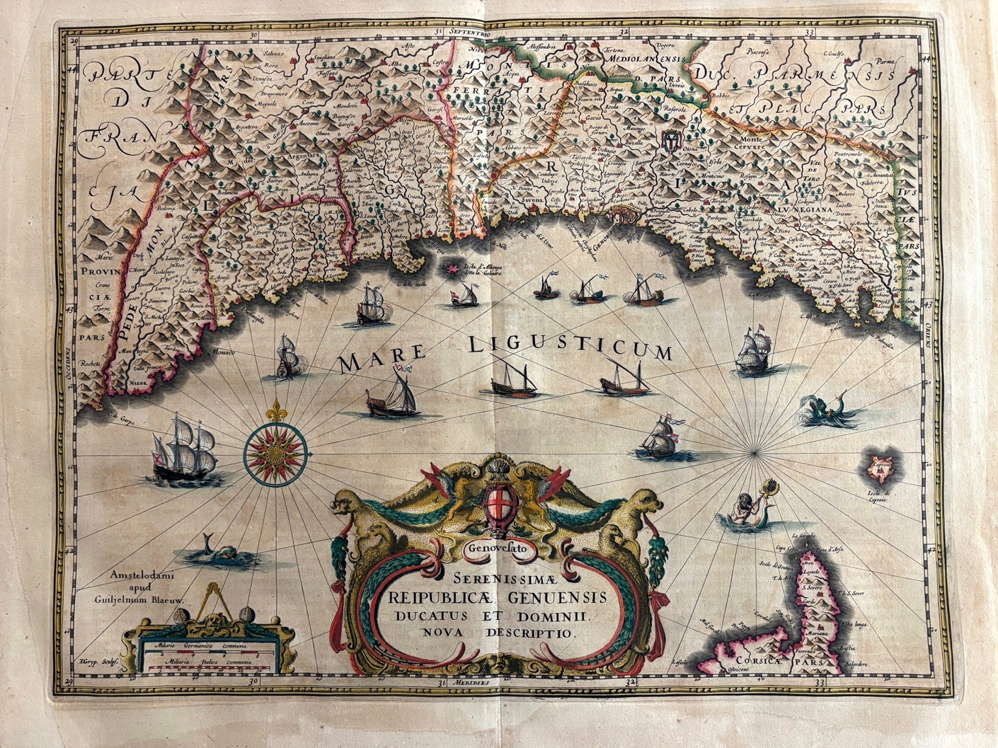 Original map representing the territories of the Genova republic.Large decorative cartouche ,mithological figures, ships and wind roses. This map comes from the first edition of the Theatrum Orbis terrarum sive Atlas Novus. Blaeu ( 1571-1638) was the most important cartographer and editor of atlases in Amsterdam in the first part of XVII century. He studied with Tycho Brahe in 1596 and acquired a wide knowledge in cartography and cosmography. Since 1608 he began the publication of sea routiers and atlases of the european coasts , globes ,instruments and atlases. In 1630 he published his first general atlas: Atlantis Appendix with 60 maps. he was expanding the atlas in the following years and in 1635 he published in two volumes with over 200 maps the Theatrum or Atlas Novus that was enlarged in 3,4,5 and 6 volumes and several languages ( latin, french,dutch and spanish). This core of maps was the base for the publication of the Atlas Mayor by his son Joan Blaeu from 1662 until 1672.