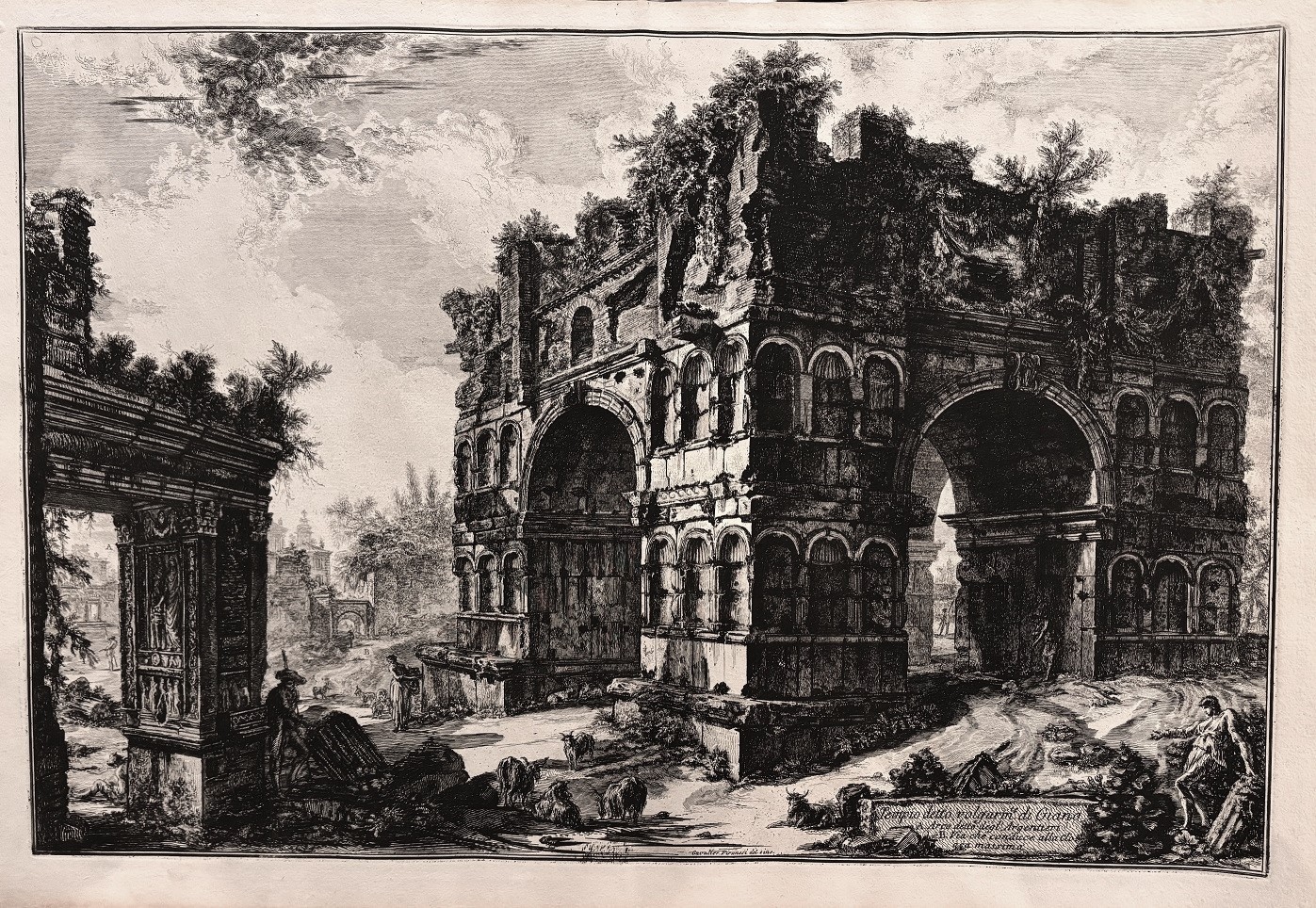 Original etching in its first state ( Hind 96-I) of the Janus cuadruple arch built at IV century d.c as a limit for the Boarium forum. The etching represents a breathtaking view with touches of chiaroscuro and dramatic effects with strong imprint of superb quality. Piranesi is considered the most important engraver at Rome during the XVIII century. Piranesi illustrated antiquities,monuments and archeological remains either in Rome and other parts of Italy. His output of etched plates is about 1000 numbers in all and most of them of larger dimensions. Piranesi provided of antiquities and restored antiques to a distinguihed international clientele visiting Rome eager to buy fragments or complete pieces for decorating their houses and palaces across Europe. The Grand Tour visitors of Rome found at the Piranesi´s workshop the best place to buy antiquities and also the etchings and different illustrated books published by Piranesi like Veduta di Roma or Antichita di Roma in 4 volumes.The circulation of Piranesis´s works along Europe meant a first hand knowledge of the classical ruins and the development of the neoclassical taste joint with the work of other authors like Hamilton,Robert Adam and Le Roy that influenced painting, decorative arts, architecture ,etc.