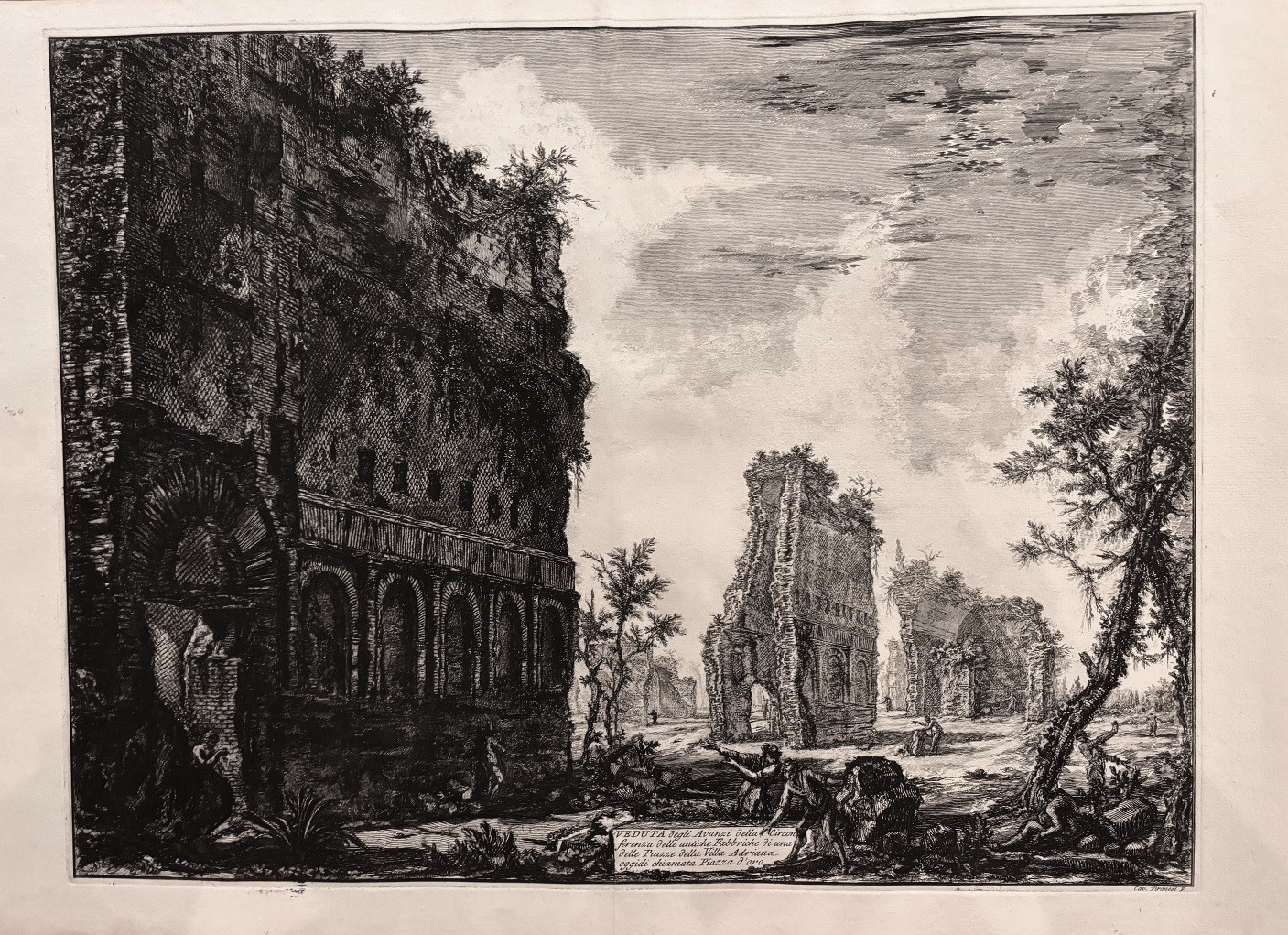 Original etching in its first state ( Hind 132 -I) of the Piazza d´oro that was a large peristyle at the Villa Adriana. The etching represents a brithtaking view with touches of chiaroscuro and dramatic effects with strong imprint of superb quality. Piranesi is considered the most important engraver at Rome during the XVIII century. Piranesi illustrated antiquities,monuments and archeological remains either in Rome and other parts of Italy. His output of etched plates is about 1000 numbers in all and most of them of larger dimensions. Piranesi provided of antiquities and restored antiques to a distinguihed international clientele visiting Rome eager to buy fragments or complete pieces for decorating their houses and palaces across Europe. The Grand Tour visitors of Rome found at the Piranesi´s workshop the best place to buy antiquities and also the etchings and different illustrated books published by Piranesi like Veduta di Roma or Antichita di Roma in 4 volumes.The circulation of Piranesis´s works along Europe meant a first hand knowledge of the classical ruins and the development of the neoclassical taste joint with the work of other authors like Hamilton,Robert Adam and Le Roy that influenced painting, decorative arts, architecture, etc.