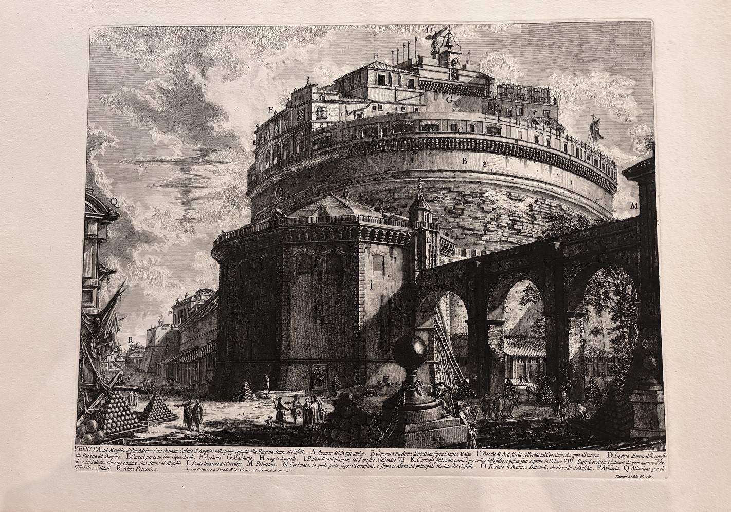 Original etching in its first state ( Hind 30-I) of the castello S. Angelo and the buildings around it. The etching represents a brithtaking view with touches of chiaroscuro and dramatic effects with strong imprint of superb quality. Piranesi is considered the most important engraver at Rome during the XVIII century. Piranesi illustrated antiquities,monuments and archeological remains either in Rome and other parts of Italy. His output of etched plates is about 1000 numbers in all and most of them of larger dimensions. Piranesi provided of antiquities and restored antiques to a distinguihed international clientele visiting Rome eager to buy fragments or complete pieces for decorating their houses and palaces across Europe. The Grand Tour visitors of Rome found at the Piranesi´s workshop the best place to buy antiquities and also the etchings and different illustrated books published by Piranesi like Veduta di Roma or Antichita di Roma in 4 volumes.The circulation of Piranesis´s works along Europe meant a first hand knowledge of the classical ruins and the development of the neoclassical taste joint with the work of other authors like Hamilton,Robert Adam and Le Roy that influenced painting, architecture, decorative arts,etc.