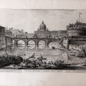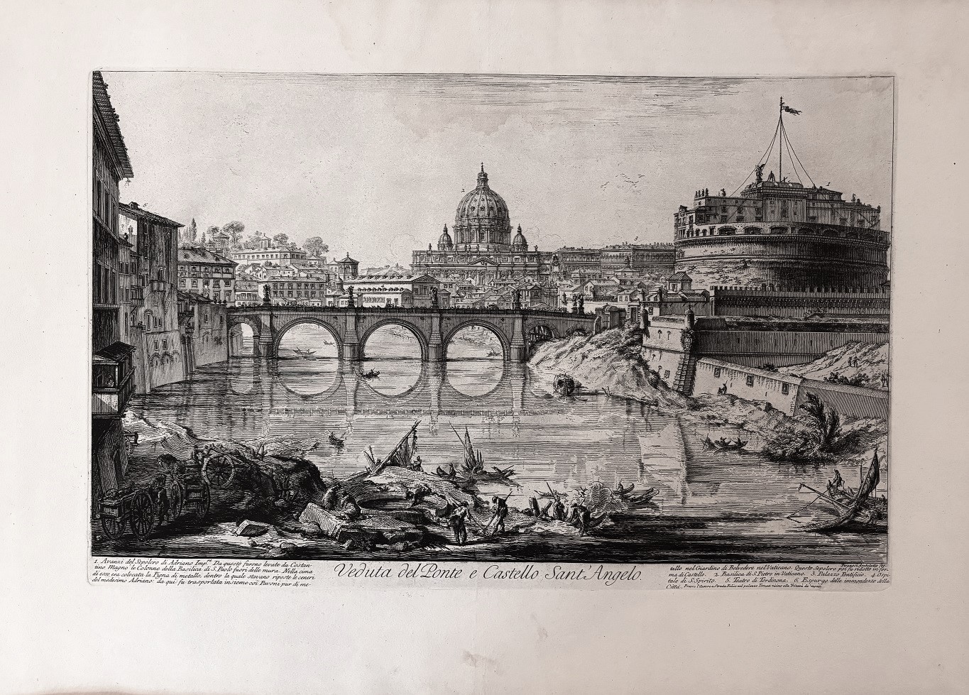 Original etching in its second state ( Hind 29-II) roman imprint of the bridge and castle of Saint Angelo. Signed below right Piranesi Architecto fecit. This imprint with address Palazzo Tomati and price .Piranesi ( 1720-1778). The etching represents with touches of chiaroscuro and dramatic effects with strong imprint of superb quality. Piranesi is considered the most important engraver at Rome during the XVIII century. Piranesi illustrated antiquities,monuments and archeological remains either in Rome and other parts of Italy. His output of etched plates is about 1000 numbers in all and most of them of larger dimensions. Piranesi provided of antiquities and restored antiques to a distinguihed international clientele visiting Rome eager to buy fragments or complete pieces for decorating theis houses and palaces across Europe. The Grand Tour visitors of Rome found at the Piranesi´s workshop the best place to buy antiquities and also the etchings and different illustrated books published by Piranesi like Veduta di Roma or Antichita de Roma in 4 volumes.The circulation of Piranesis´s works along Europe meant a first hand knowledge of the classical ruins and the development of the neoclassical taste joint with the work of Hamilton and Le Roy that influenced painting, decorative arts,etc.