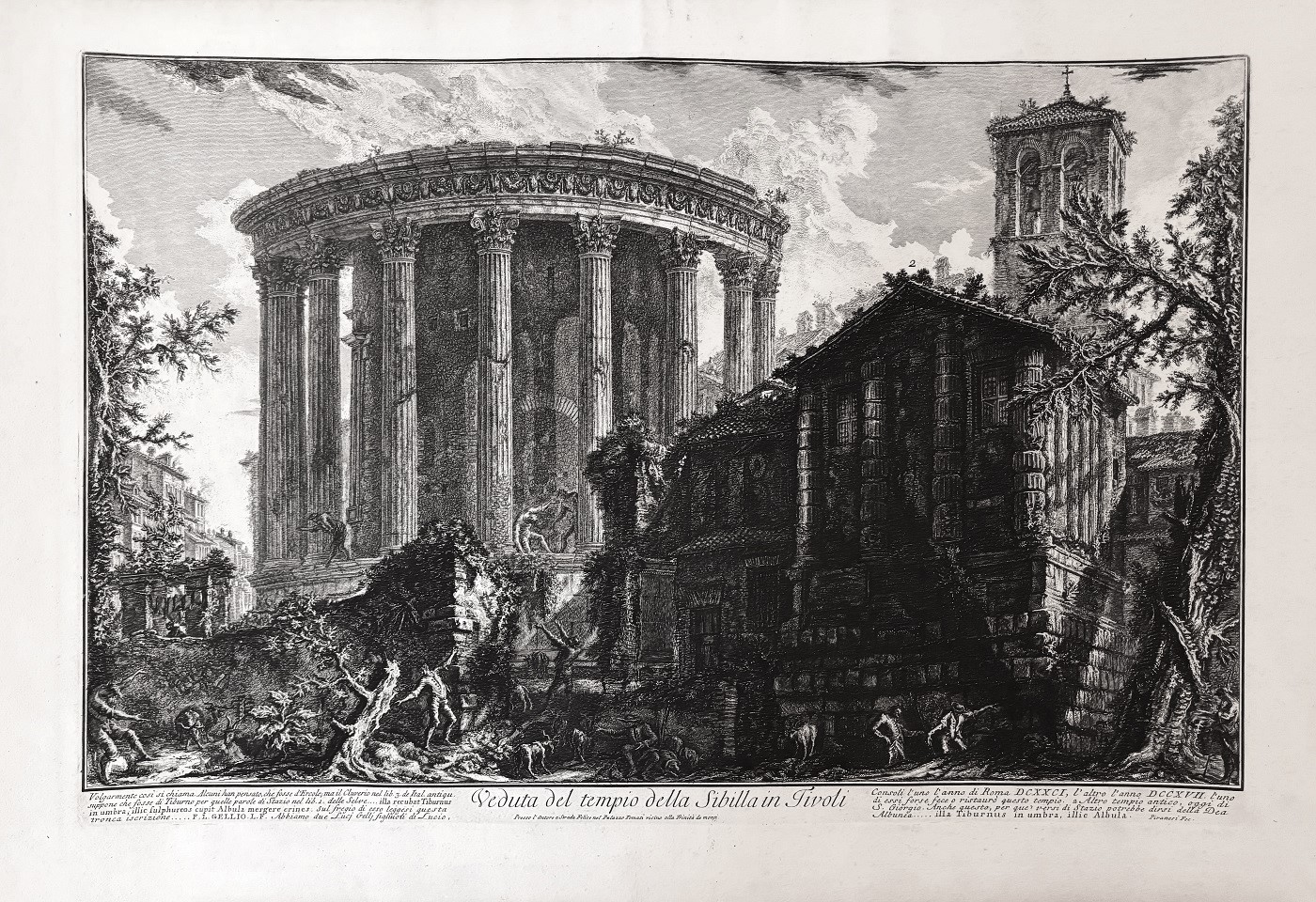 Original etching in its first state ( Hind 61-I) of the Sibyl temple at Tivoli of the I century . Signed below right Piranesi Fec .This first state printed in 1761 . Piranesi ( 1720-1778). The etching represents with touches of chiaroscuro and dramatic effects with strong imprint os superb quality. Piranesi is considered the most important engraver at Rome during the XVIII century. Piranesi illustrated antiquities,monuments and archeological remains either in Rome and other parts of Italy. His output of etched plates is about 1000 numbers in all and most of them of larger dimensions. Piranesi provided of antiquities and restored antiques to a distinguihed international clientele visiting Rome eager to buy fragments or complete pieces for decorating theis houses and palaces across Europe. The Grand Tour visitors of Rome found at the Piranesi´s workshop the best place to buy antiquities and also the etchings and different illustrated books published by Piranesi like Veduta di Roma or Antichita de Roma in 4 volumes.The circulation of Piranesis´s works along Europe meant a first hand knowledge of the classical ruins and the development of the neoclassical taste joint with the work of Hamilton and Le Roy that influenced painting, decorative arts,etc.