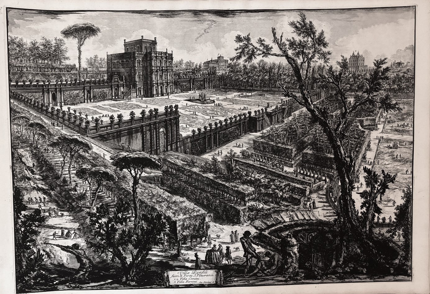 Original etching in its first state ( Hind 124-I) of the Villa Panphilj. Signed below Cavaliere Piranesi.This first state printed in 1776 just two years before the death of Piranesi ( 1720-1778). The etching represents the Villa Panphilj built by Alessandro Algardi between 1644-52 . Piranesi is considered the most important engraver at Rome during the XVIII century. Piranesi illustrated antiquities,monuments and archeological remains either in Rome and other parts of Italy. His output of etched plates is about 1000 numbers in all and most of them of larger dimensions. Piranesi provided of antiquities and restored antiques to a distinguihed international clientele visiting Rome eager to buy fragments or complete pieces for decorating theis houses and palaces across Europe. The Grand Tour visitors of Rome found at the Piranesi´s workshop the best place to buy antiquities and also the etchings and different illustrated books published by Piranesi like Veduta di Roma or Antichita de Roma in 4 volumes.The circulation of Piranesis´s works along Europe meant a first hand knowledge of the classical ruins and the development of the neoclassical taste joint with the work of Hamilton and Le Roy that influenced painting, decorative arts,etc.