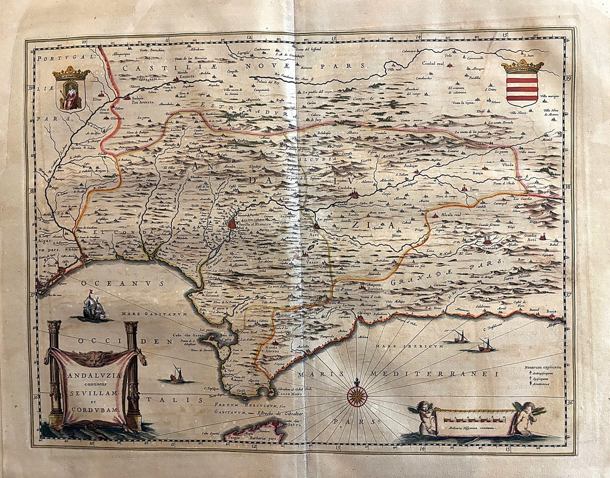 Mapa calcográfico en buen estado representando el territorio de Andalucia occidental.Cartela, escalas, rosa vientos y escudos heráldicos.El mapa proviene de la primera edición del Atlas Novus de Blaeu impresa en 1635 en Amsterdam.