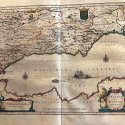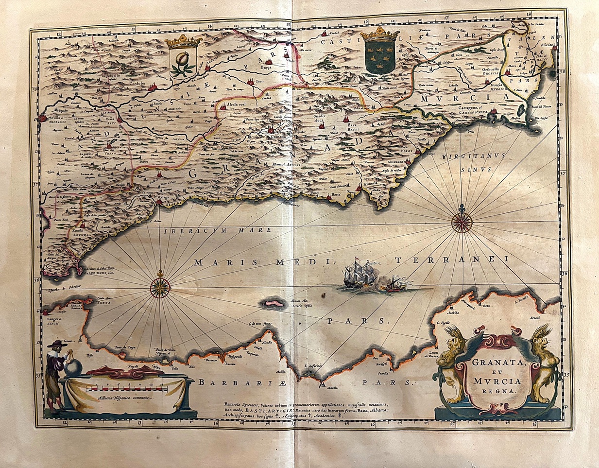 Mapa calcográfico que representa los territorios de Andalucia orienatl y el Reino de Murcia, escalas, cartelas decorativas con figuras,barcos y rosa de los vientos en el Mediterraneo. este mapa procede de la primera edición del Atlas Novus de Blaeu publicado en 1635 .