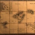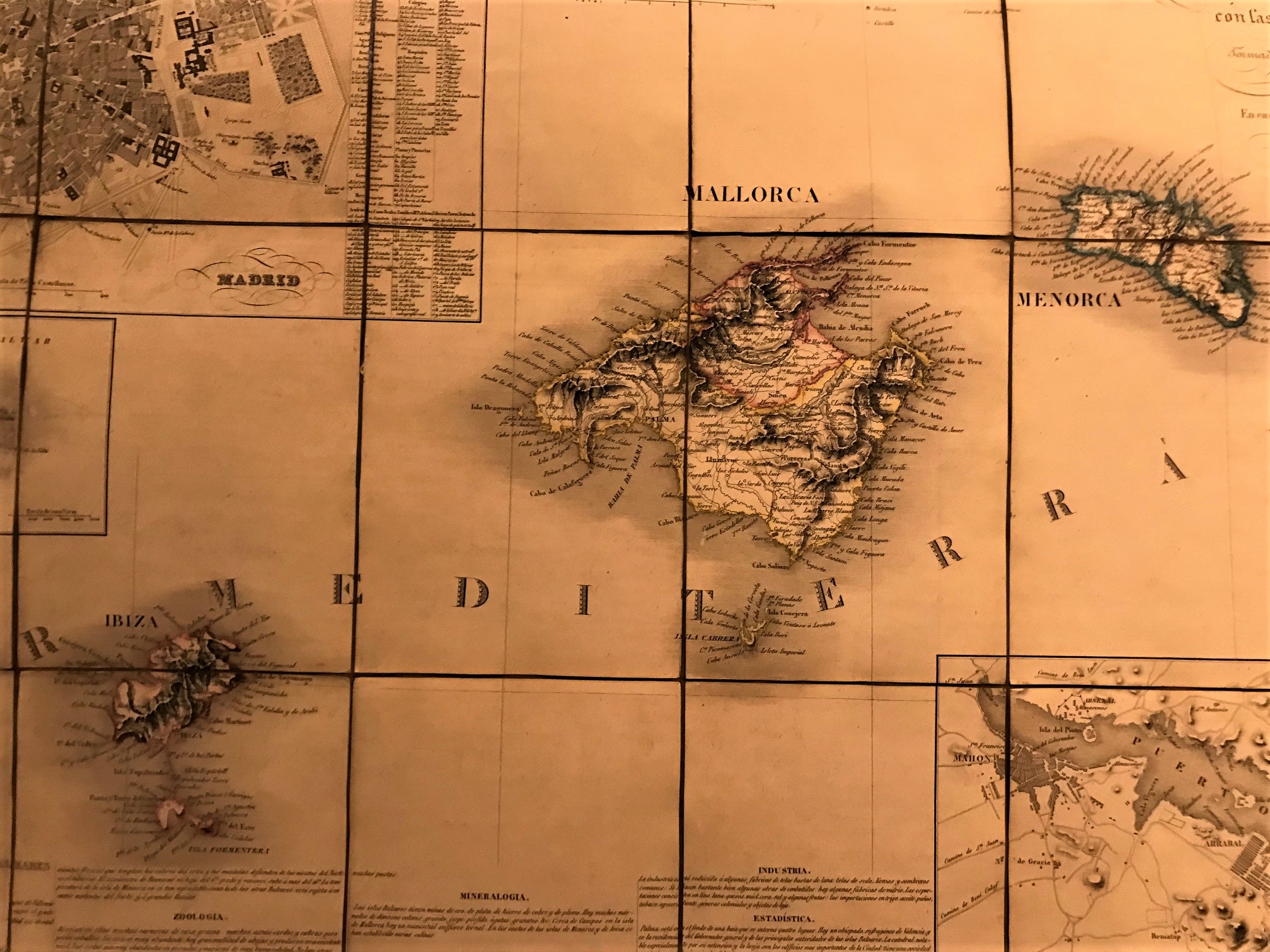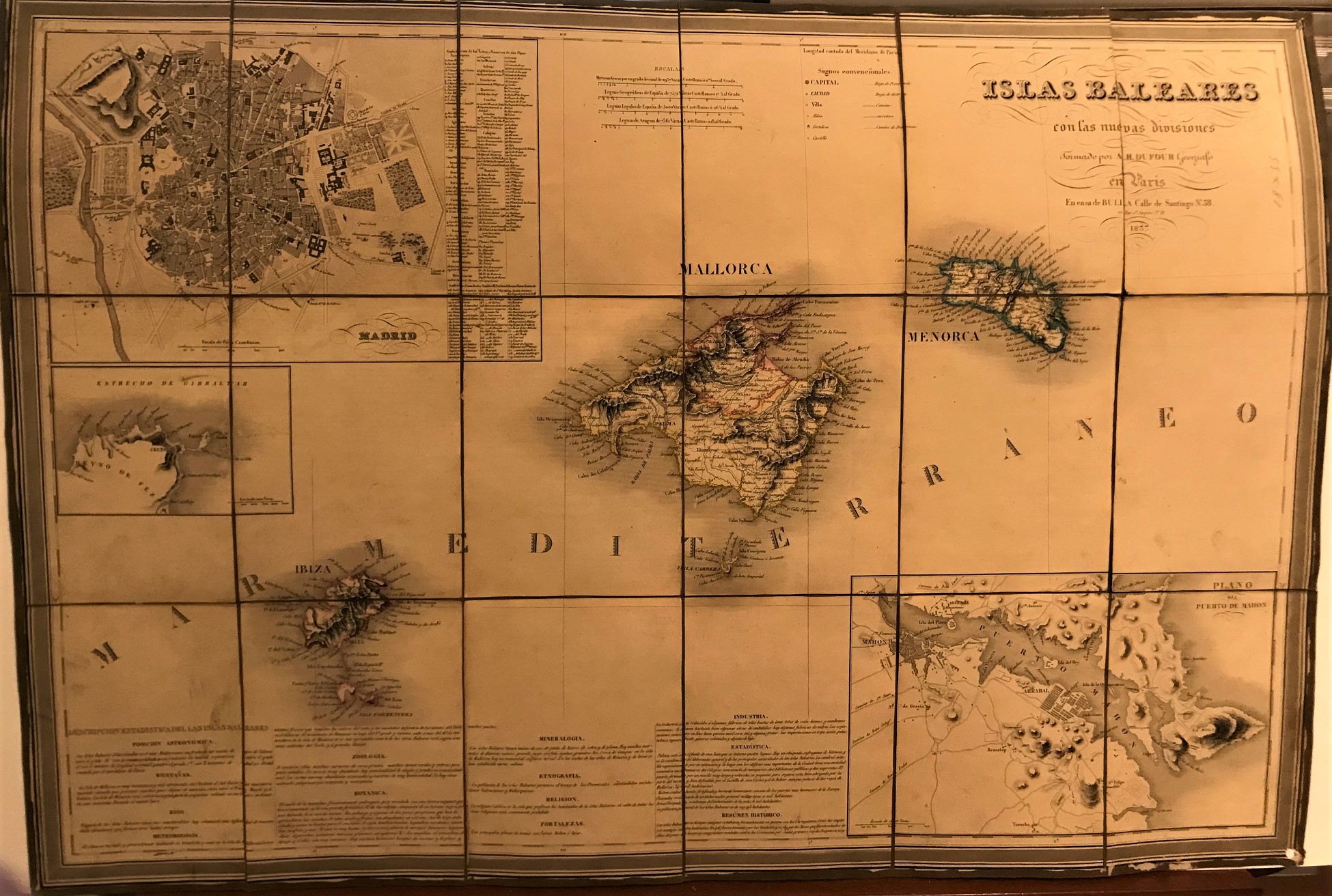 Mapa grabado que muestra las tres islas y planos insertos del puerto de Mahón,Estrecho de Gibraltar, plano de Madrid y un texto con descripción estadística de las islas.